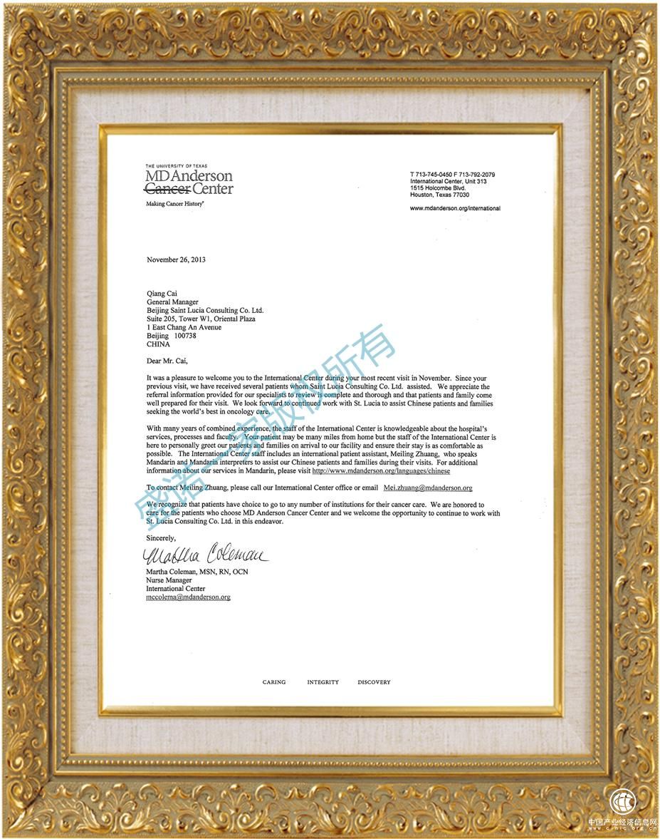 據(jù)了解,MD安德森癌癥中心擁有全美最佳癌癥??婆琶谝?,癌癥患者五年生存率達(dá)80%……,自此以后,中國(guó)公民只需在護(hù)照、簽證、病歷準(zhǔn)備到位之后(約兩周時(shí)間),中國(guó)的腫瘤患者就可以坐到領(lǐng)先美國(guó)癌癥治療的MD安德森癌癥中心的專家面前,接受診治。