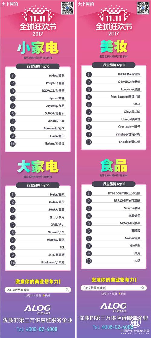 在這樣一個(gè)流量爆棚的日子,消費(fèi)者徜徉在“買買買”的喜悅中的同時(shí),更是對廣大品牌的大閱兵。從公布的各行業(yè)天貓雙十一店鋪銷售排行來看,國貨品牌完成了本次戰(zhàn)役的全面勝利!海爾領(lǐng)跑大家電行業(yè),美的在小家電行業(yè)領(lǐng)先,百雀羚、三只松鼠、林氏木業(yè)、海瀾之家、維達(dá)紙業(yè)等在各自所屬領(lǐng)域,都取得了NO.1的佳績。以上這些品牌,在本次雙十一戰(zhàn)役中,向世界完美宣布了中國新國貨時(shí)代的來臨,是民族品牌的驕傲!