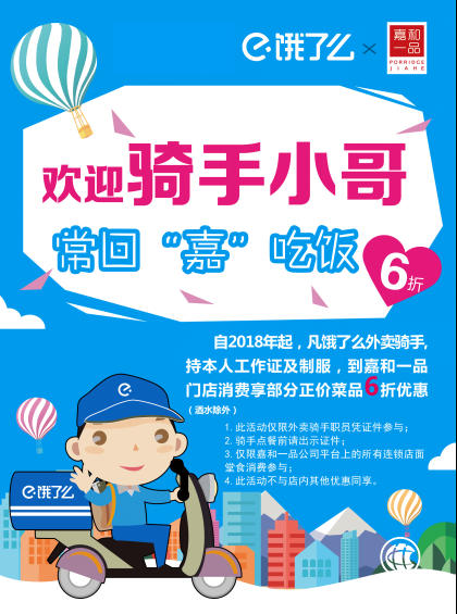 自2018年起,為了感謝餓了么外賣小哥不辭勞苦的付出,凡餓了么外賣騎手,持本人工作證及制服,到嘉和一品門店消費可享受部分正價菜品6折優(yōu)惠。