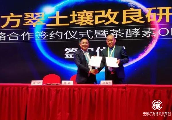 東方翠董事長林錐與谷菲生物董事長趙書春,簽署了年銷售額8000萬元戰(zhàn)略合作協(xié)議及茶酵素ODM訂購供貨合同