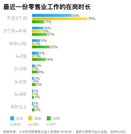 調(diào)查顯示,如果新生代員工在同一個基層崗位上,在已經(jīng)能夠充分勝任崗位要求的前提下,越是工作內(nèi)容相對單一枯燥的崗位,其離職的時間就越短。因此大部分零售業(yè)靈活就業(yè)者的在崗時長都較短,整體來看超過五成不足3個月,流失率較高。