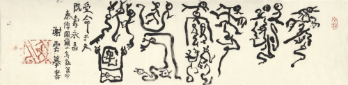 “世界上的一切都充滿誘惑/射入我的祖先造字的音符里/裊裊余音叩問/歲月綿長(zhǎng)。”謝云先生以特有的骨法用筆連綿揮灑,一氣呵成,看似單調(diào)的油墨,煥發(fā)出輝麗的繽紛光彩,這是他對(duì)古文字在審美方面探求的夢(mèng)。