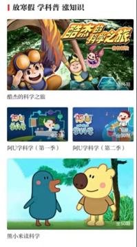 “網(wǎng)絡(luò)動畫片”欄目里有海量內(nèi)容供您選擇哦。“放寒假學(xué)科普漲知識”專題,您可以帶著娃一起跟酷杰、阿U、熊小米學(xué)習(xí)科學(xué)小知識,遨游在神奇的科學(xué)海洋。