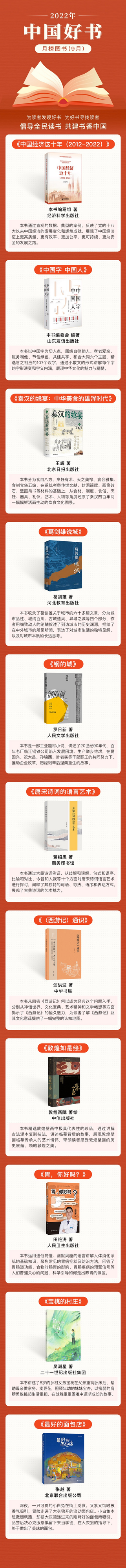 在中宣部出版局指導(dǎo)下,經(jīng)中國(guó)圖書評(píng)論學(xué)會(huì)組織評(píng)選,2022年9月“中國(guó)好書”榜單發(fā)布:《中國(guó)經(jīng)濟(jì)這十年(2012-2022)》《中國(guó)字 中國(guó)人》《秦漢的饗宴:中華美食的雄渾時(shí)代》《葛劍雄說(shuō)城》《鋼的城》《唐宋詩(shī)詞的語(yǔ)言藝術(shù)》《〈西游記〉通識(shí)》《敦煌如是繪》《胃,你好嗎?》《寶桃的村莊》《最好的面包店》入選。