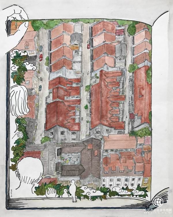 上海,一個(gè)虛幻而深刻的城市,一本虛幻而深刻的書,一面虛幻而深刻的鏡子。在金宇澄為《童話》所畫的插畫《上海屋頂》中,當(dāng)“女孩和同事來到這條熟悉的小街”,眺望那些洋房的紅色屋頂,她們其實(shí)是在俯視一本打開的書:一只巨大的手握著書的一角。在這里,文學(xué)、插畫與上海這座城市合三為一了:《童話》中的人覺得真實(shí)的城市空間,不過是書中的一幅插畫,而在這城市中生活的人,不過是插畫中的幾個(gè)線條與色塊。