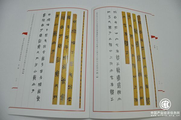 最后不能不提到的,就是此書的裝幀設(shè)計(jì)。每一頁(yè)圖版都有竹簡(jiǎn)近原大及放大照片,又附以文字圖像和隸定文字,每一篇后再附上釋文,特別方便臨習(xí)閱讀;而全書的朱絲欄,起到了整體和諧統(tǒng)一的效果。每輯四十幾頁(yè),采用騎馬釘,又適合置于案頭閱讀和臨習(xí)。
