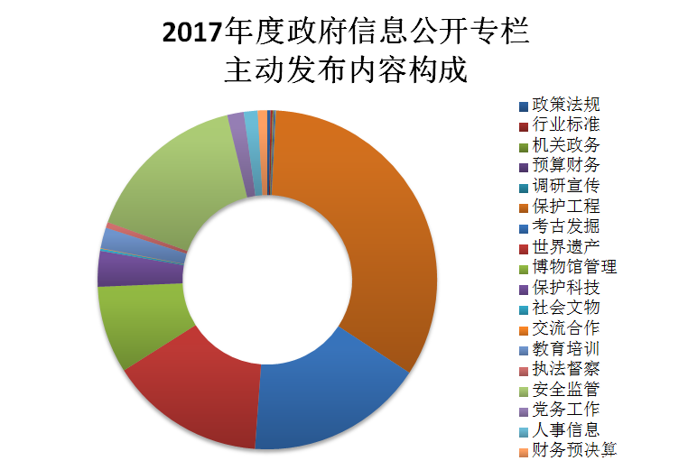報(bào)告顯示,在2017年主動(dòng)發(fā)布的1972件政務(wù)信息中,依照事務(wù)類別分為:政策法規(guī)6條,行業(yè)標(biāo)準(zhǔn)4條,機(jī)關(guān)政務(wù)2條,預(yù)算財(cái)務(wù)2條,調(diào)研宣傳2條,保護(hù)工程659條,考古發(fā)掘334條,世界遺產(chǎn)293條,博物館管理164條,保護(hù)科技67條,社會(huì)文物4條,交流合作1條,教育培訓(xùn)39條,執(zhí)法督察11條,安全監(jiān)管309條,黨務(wù)工作31條,人事信息26條;財(cái)務(wù)預(yù)決算更新18條。新增行業(yè)標(biāo)準(zhǔn)欄目,并更新79條,機(jī)構(gòu)設(shè)置及其他重要欄目共更新162條。根據(jù)要求新增派駐機(jī)構(gòu)相關(guān)欄目,轉(zhuǎn)載文化部派駐監(jiān)督相關(guān)信息,共27條。2017年,通過(guò)政府網(wǎng)站信息公開(kāi)專欄查閱政府信息約2904萬(wàn)人次,比2016年度增加7.5%。