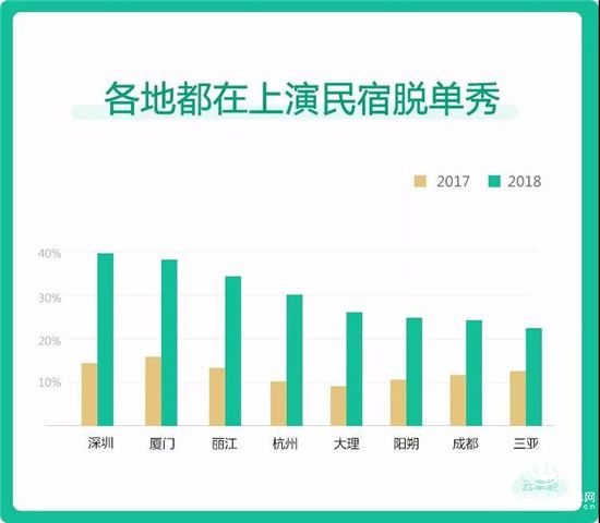 從民宿營收方面來看,半數(shù)以上民宿跑不贏GDP,54%的民宿收入增速低于6%。即使是民宿十大熱門目的地,也只是廈門、北京、程度、杭州這些地方跑贏GDP增長的民宿多一些。與此同時,隨著行業(yè)洗牌加劇,大批民宿開始脫單,從2017年9%發(fā)展到2018年30%的門店開始告別單點模式,其中深圳、廈門、麗江等地占比較高。之所以出現(xiàn)這種局面,“一方面是因為好的民宿在不斷擴張,如大理、麗江等地有很多優(yōu)秀的民宿品牌,他們都在不斷開新店,另一方面,越來越多的民宿開始把自己的民宿交給專門的運營團隊統(tǒng)一管理”。