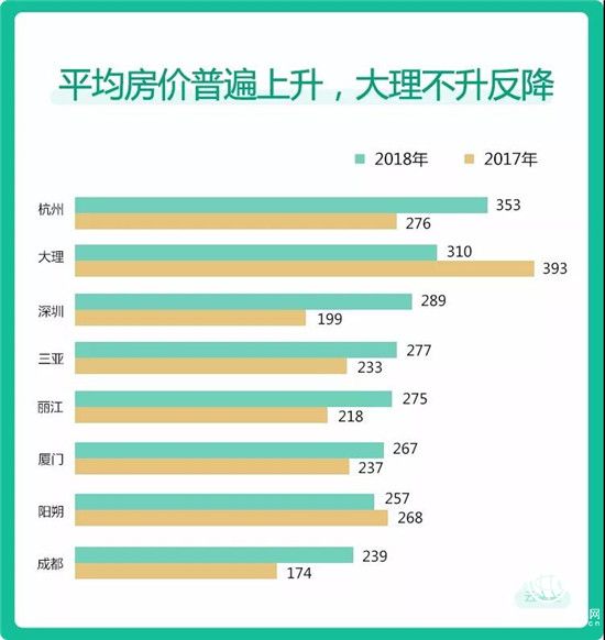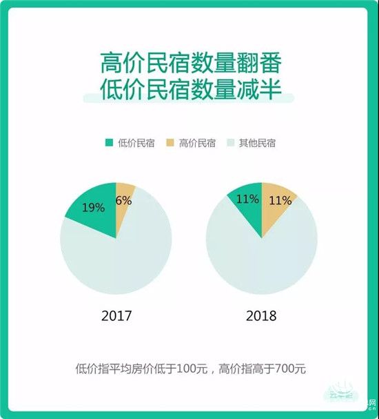 在民宿平均房價方面,整體呈現(xiàn)高價民宿數(shù)量翻番,低價民宿數(shù)量減半的趨勢。2017年高價(大于等于700元)民宿占比僅為6%,2018年高價民宿占比11%,在消費升級的拉動下,整個行業(yè)的平均房價也在不斷增加。從城市分布角度來看,京杭高價民宿約占兩成,大理、上海、深圳超過9%,而北京周邊、杭州周邊包括大理海邊的民宿均價也非常高。
