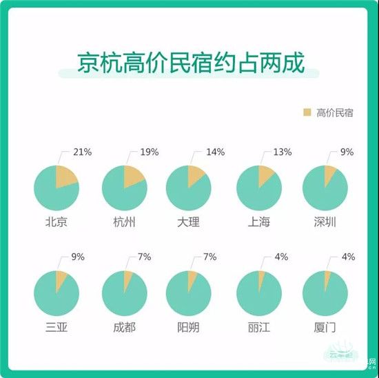 根據(jù)報告,三七定律同樣適用于民宿行業(yè),即“30%的民宿貢獻了整個行業(yè)70%的收入”。以麗江、廈門、大理、成都、杭州、三亞、上海、北京、深圳、陽朔為代表的十大熱門目的地民宿,統(tǒng)攬整個行業(yè)50%的收入。這其中,因2018年大理環(huán)保治理關停了很多民宿,使得大理從原本的第一梯隊降到了第二梯隊。