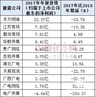 廣電網(wǎng)絡(luò)板塊。在披露年報(bào)的11家企業(yè)中,東方明珠歸屬于母公司凈利潤22.37億元,排在第一位,但同比下降23.76%;湖北廣電網(wǎng)絡(luò)歸屬于上市公司股東的凈利潤3.35億元,同比增長10.56%,增幅最大;電廣傳媒歸屬于上市公司股東凈利潤為-4.64億元,同比下降239.37%,虧損和降幅最大,公司稱凈利潤同比下降原因主要是有線網(wǎng)絡(luò)業(yè)績有較大幅度下滑、公司依會(huì)計(jì)準(zhǔn)則對(duì)商譽(yù)及長期股權(quán)投資等計(jì)提減值準(zhǔn)備。整體而言,2017年我國廣電網(wǎng)絡(luò)行業(yè)呈現(xiàn)出整體下行的趨勢,僅有5家企業(yè)業(yè)績與上年同期相比有所增加。