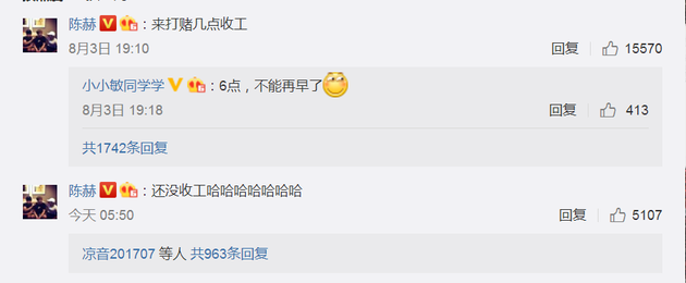 網友見此紛紛留言回復:“6點,不能再早了!”也有網友關心道:“赫哥,工作也要好好休息呀!”“辛苦辛苦,要瘦啦!”陳赫在4日凌晨五點五十評論道:“還沒收工哈哈哈哈哈哈哈!”
