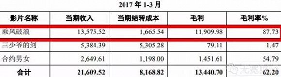2017年1月,韓寒執(zhí)導(dǎo)、編劇的電影作品《乘風(fēng)破浪》上映并獲得10.46億票房收入。韓寒進(jìn)入10億票房導(dǎo)演俱樂(lè)部,亭東影業(yè)、橙子映像、博納影業(yè)等8家出品方也因此獲益不菲。據(jù)博納影業(yè)招股書(shū)透露,該電影博納影業(yè)投入成本1665萬(wàn),影片收入為1.35億,毛利率達(dá)到87.73%。