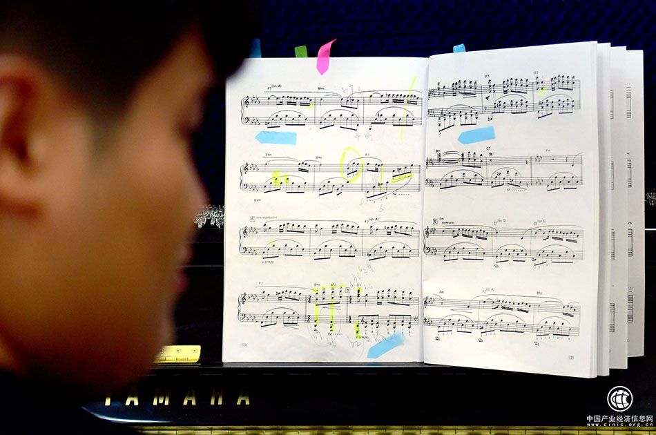 張原郡坐在鋼琴前研究著琴譜,他所用的琴譜上用各色彩筆和標(biāo)簽紙作著各種標(biāo)記。
