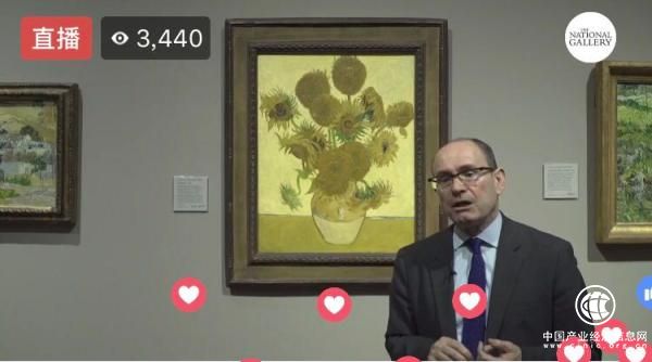 倫敦國家美術(shù)館策展人Christopher Riopelle在凡·高的《向日葵》前向全世界的網(wǎng)友直播介紹這件作品。