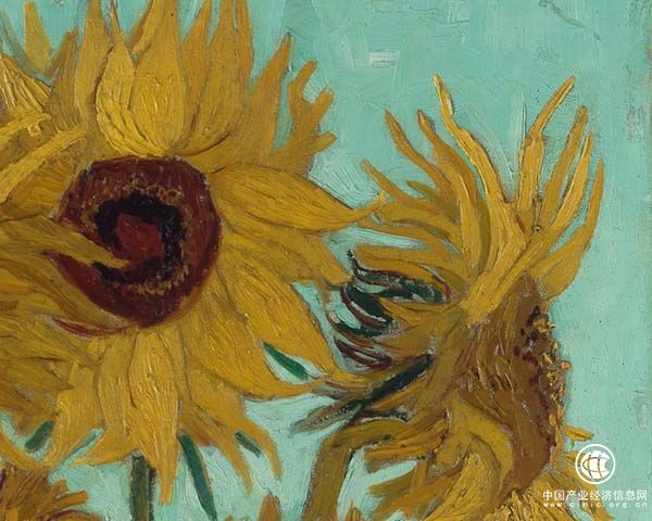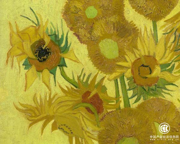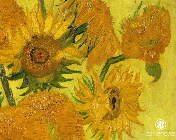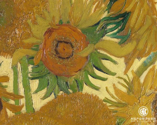 現(xiàn)藏于阿姆斯特丹的這件作品是根據(jù)倫敦那一幅繪就的,它們有很多相似性,例如同樣有15朵花,花的姿態(tài)也大同小異。但是在細(xì)微之處,凡·高做了很多改變。盡管一樣是黃色為底色,藝術(shù)家還是作了很多顏色上的變化,“仿佛是一出黃色的交響曲”。
