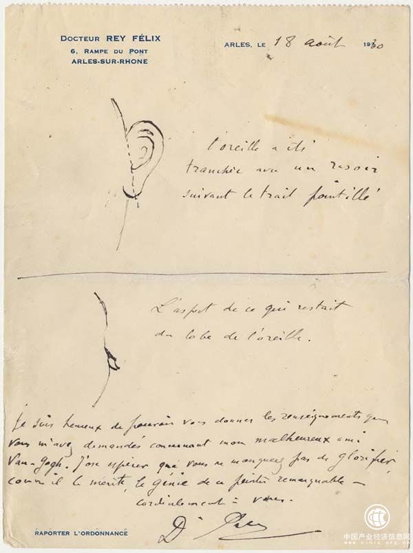 1930年8月18日,費(fèi)利克斯•雷伊給歐文•斯通書信中的梵高耳朵的肢解圖紙,加州大學(xué)伯克利分校班克羅夫特圖書館藏