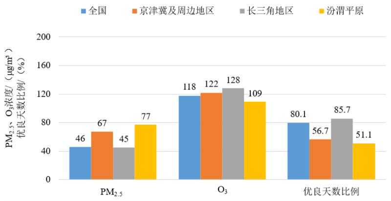 圖3 2023年1—3月全國(guó)及重點(diǎn)區(qū)域空氣質(zhì)量比較