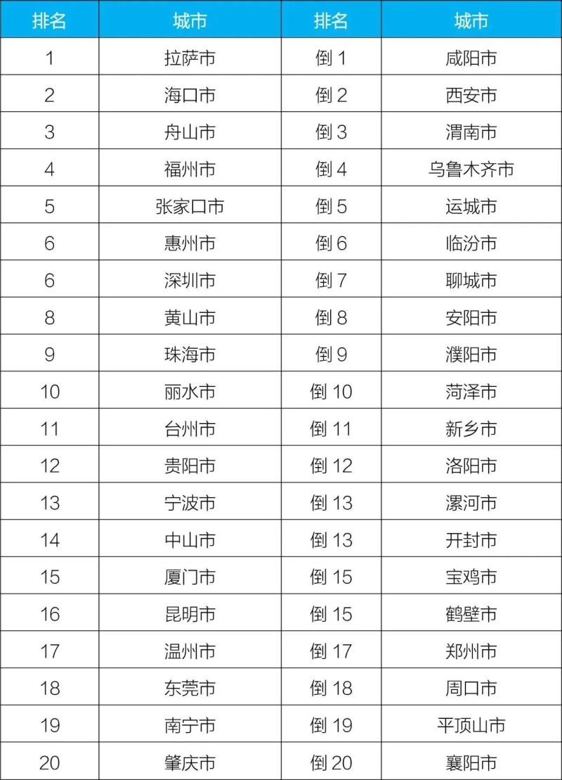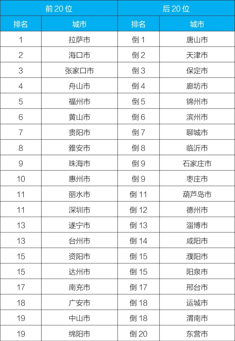 3月,168個(gè)重點(diǎn)城市中,拉薩、海口和張家口市等20個(gè)城市空氣質(zhì)量相對(duì)較好(從第1名至并列第19名);唐山、天津和保定市等20個(gè)城市空氣質(zhì)量相對(duì)較差(從倒數(shù)第1名至倒數(shù)第20名)。見(jiàn)附表1。