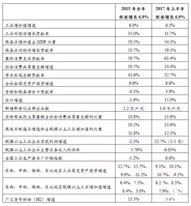 2015年全年和2017年上半年,我國國內(nèi)生產(chǎn)總值(GDP)增長均為6.9%。兩個6.9%都產(chǎn)生于經(jīng)濟新常態(tài)背景下,經(jīng)濟運行都處在合理區(qū)間內(nèi),但兩個數(shù)據(jù)分別形成于“十二五”收官之年與供給側(cè)結(jié)構(gòu)性改革深化之年,發(fā)展條件和運行態(tài)勢有所異同。前者是經(jīng)濟持續(xù)下行過程中市場預(yù)期較為悲觀條件下形成的,更多反映出經(jīng)濟周期性回落、調(diào)速不失勢;后者是經(jīng)濟企穩(wěn)回升過程中市場信心增強條件下形成的,更多體現(xiàn)為經(jīng)濟恢復(fù)性反彈、量增質(zhì)更優(yōu)。總的來看,增速相同但形似神離,對應(yīng)的經(jīng)濟結(jié)構(gòu)和質(zhì)量效益均存在差異,增長內(nèi)涵不完全一樣,當(dāng)前這個6.9%的含金量更高。