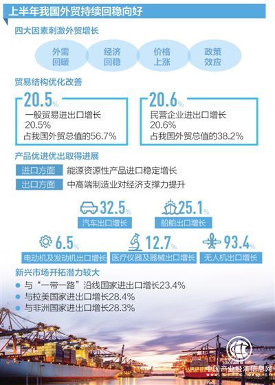 黃頌平說(shuō),今年上半年,全球經(jīng)濟(jì)溫和復(fù)蘇,國(guó)內(nèi)經(jīng)濟(jì)穩(wěn)中向好,外需回暖、經(jīng)濟(jì)回穩(wěn)、價(jià)格上漲、政策效應(yīng)等四大因素推動(dòng)上半年外貿(mào)回穩(wěn)向好。