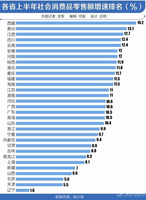 根據(jù)國(guó)家統(tǒng)計(jì)局?jǐn)?shù)據(jù),今年上半年全國(guó)社會(huì)消費(fèi)品零售額增速中西部地區(qū)最高。其中西藏以14.2%的速度位居全國(guó)第一;貴州名列第二,為13.1%。上述兩地同期居民人均可支配收入增速也為全國(guó)第一、第二名,分別達(dá)到了14.3%、10.9%。
