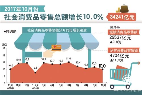 ——從生產(chǎn)看,規(guī)模以上工業(yè)增加值同比增速加快0.1個百分點;服務(wù)業(yè)生產(chǎn)指數(shù)同比增速加快0.2個百分點。從需求看,社會消費品零售總額同比增速持平;前10個月固定資產(chǎn)投資增速雖比1至9月份略有回落,但投資在優(yōu)化供給結(jié)構(gòu)方面的作用持續(xù)發(fā)揮;10月份出口同比增長6.1%,而上年同月出口下降了3.8%。