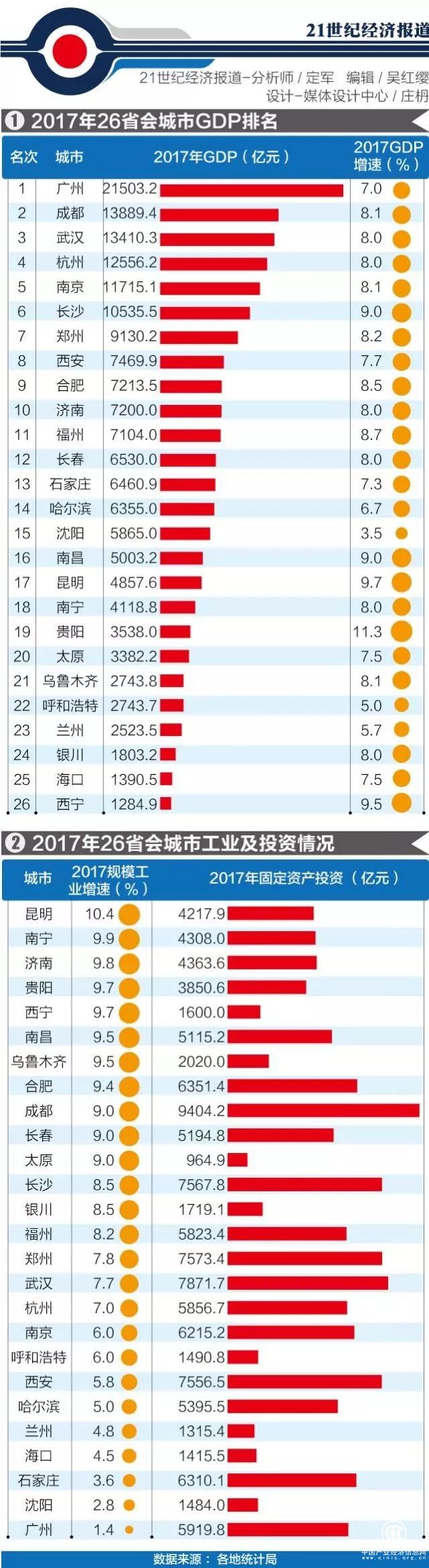 2017年全國26省會城市GDP(注:本文未納入拉薩)以及增速發(fā)生了較大變化,反映出區(qū)域經(jīng)濟顯現(xiàn)新的格局。