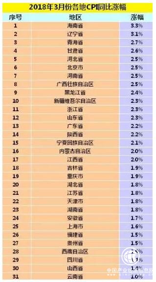 不過,隨著多數(shù)地區(qū)物價漲幅的收窄,CPI漲幅處于“3時代”的地區(qū)數(shù)量大幅減少。數(shù)據(jù)顯示,2月份11個省份CPI同比漲幅超過了3%,而3月份減少到只有兩個省份,即海南和遼寧。