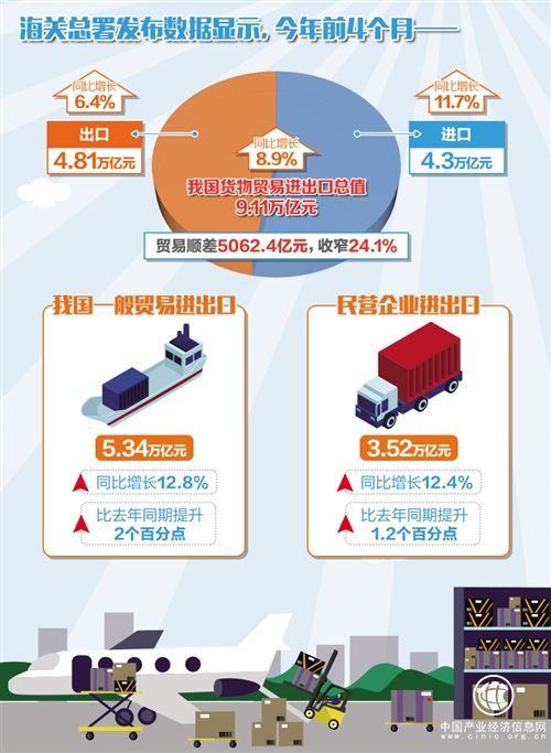 今年前4個(gè)月,我國(guó)貨物貿(mào)易進(jìn)出口總值9.11萬(wàn)億元人民幣,同比增長(zhǎng)8.9%。其中,出口4.81萬(wàn)億元,增長(zhǎng)6.4%;進(jìn)口4.3萬(wàn)億元,增長(zhǎng)11.7%;貿(mào)易順差5062.4億元,收窄24.1%。