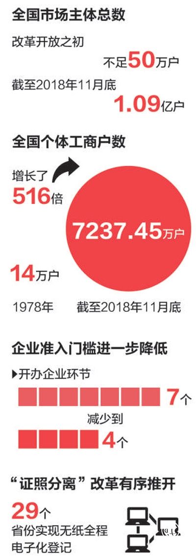 近年來,在商事制度改革不斷深入的大背景下,我國(guó)市場(chǎng)主體數(shù)量節(jié)節(jié)攀升,新設(shè)企業(yè)速度明顯加快。我國(guó)市場(chǎng)主體從改革開放之初的不足50萬戶,到2018年11月底,全國(guó)實(shí)有市場(chǎng)主體1.09億戶。特別是近5年來,我國(guó)各類市場(chǎng)主體總量增加70%以上。
