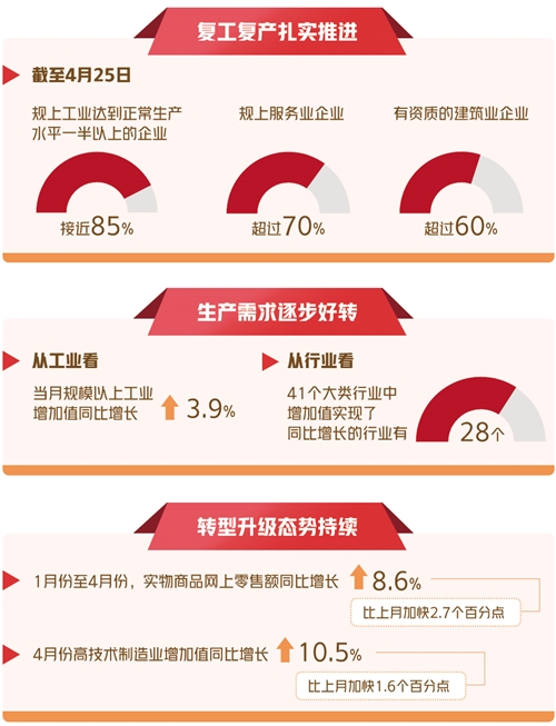 5月15日,國(guó)家統(tǒng)計(jì)局公布了前4個(gè)月國(guó)民經(jīng)濟(jì)運(yùn)行情況。4月份,隨著國(guó)內(nèi)疫情防控向好態(tài)勢(shì)持續(xù)鞏固,復(fù)工復(fù)產(chǎn)復(fù)市扎實(shí)推進(jìn),生產(chǎn)需求逐步好轉(zhuǎn),基礎(chǔ)產(chǎn)業(yè)支撐有力,市場(chǎng)預(yù)期總體穩(wěn)定,新動(dòng)能逆勢(shì)增長(zhǎng),經(jīng)濟(jì)活躍度提升,主要指標(biāo)延續(xù)3月份以來(lái)恢復(fù)改善勢(shì)頭。