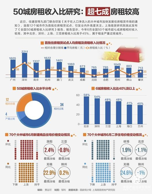 近日,住建部等九部門聯(lián)合印發(fā)《關于在人口凈流入的大中城市加快發(fā)展住房租賃市場的通知》,選取12個城市作為首批住房租賃試點,引發(fā)業(yè)內外高度關注。上海易居研究院就此發(fā)布了《全國50城房租收入比研究》報告,報告顯示,2017年6月全國50個城市超七成房租相對收入較高,其中北京、深圳、上海、三亞房租收入比高于45%,屬于租金嚴重過高城市。