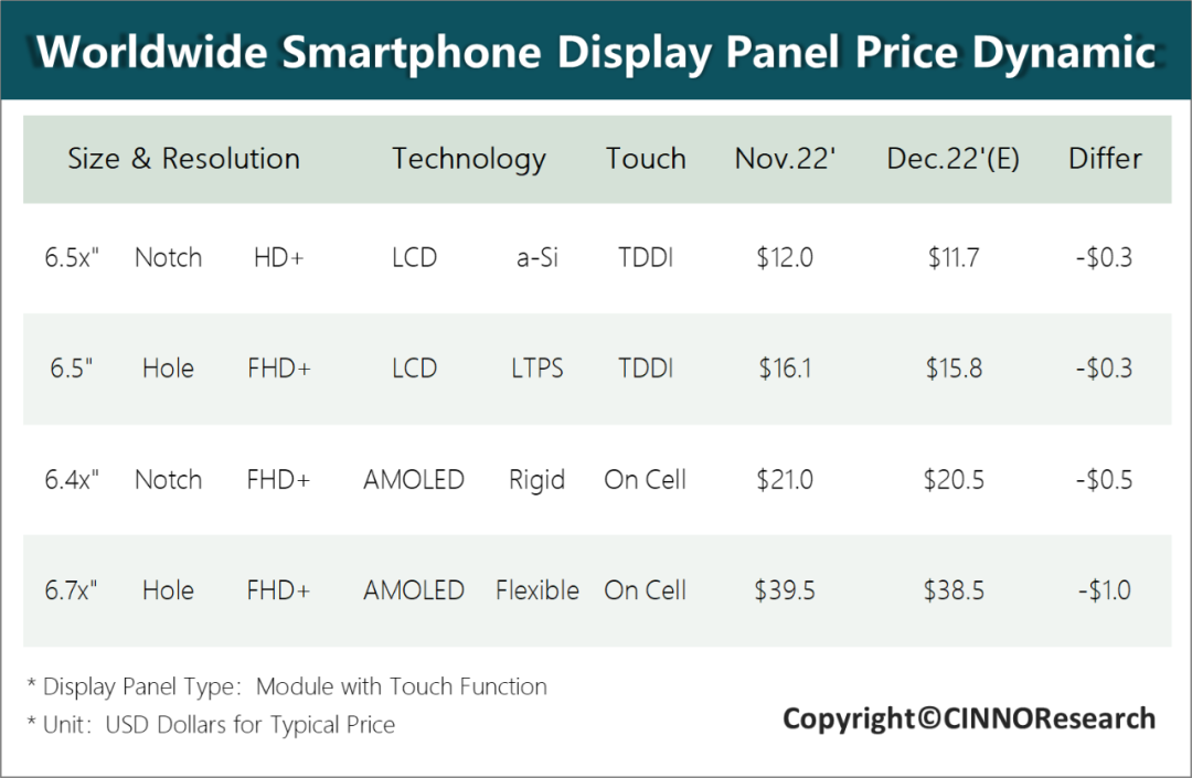 CINNO Research 預測,在需求沒有明顯利好因素的情況下,智能手機面板價格將持續(xù)走低,2022 年 12 月和 2023 年 1 月 a-Si / LTPS 面板價格將每月下降 0.3 美元;剛性 AMOLED 面板價格將繼續(xù)下降 0.5 美元;柔性 AMOLED 面板價格或?qū)⑾陆?1 美元。