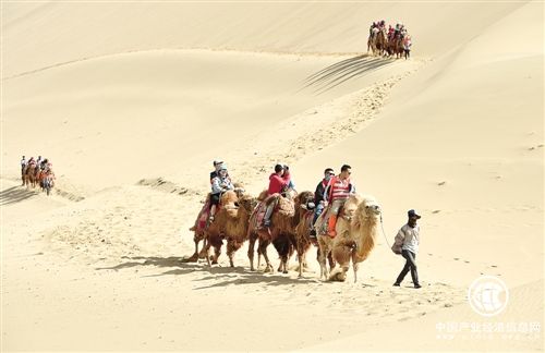 游客在甘肅敦煌鳴沙山騎駱駝。 新華社記者 范培珅攝