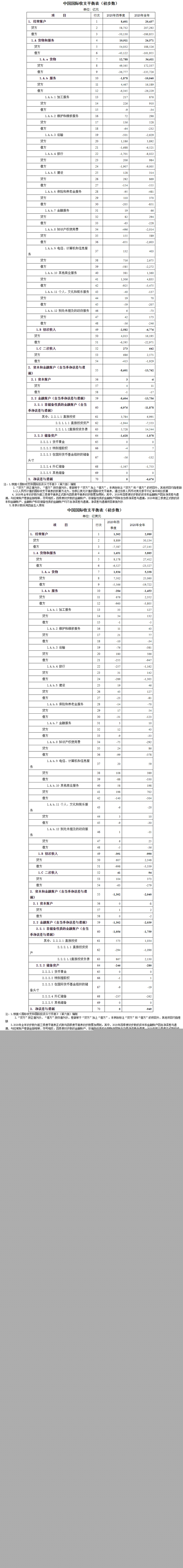 2020年,我國經(jīng)常賬戶順差20437億元,其中,貨物貿(mào)易順差36611億元,服務(wù)貿(mào)易逆差10040億元,初次收入逆差6776億元,二次收入順差642億元。資本和金融賬戶中,直接投資順差6991億元,儲備資產(chǎn)增加1878億元。