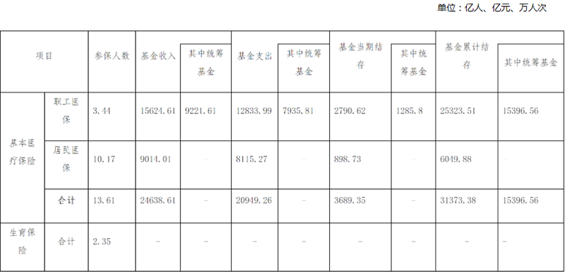 全年基本醫(yī)療保險(xiǎn)基金(含生育保險(xiǎn))總收入、總支出分別為24638.61億元、20949.26億元,年末基本醫(yī)療保險(xiǎn)(含生育保險(xiǎn))累計(jì)結(jié)存31373.38億元[2]。