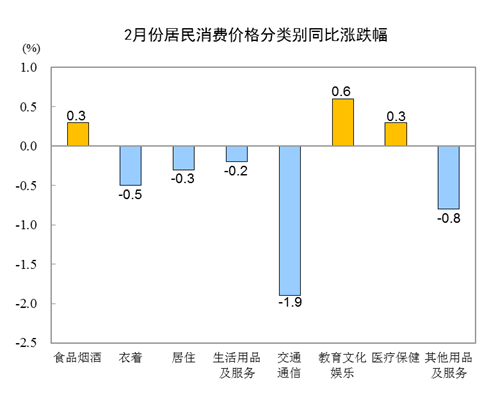 2月份,食品煙酒類價(jià)格同比上漲0.3%,影響CPI(居民消費(fèi)價(jià)格指數(shù))上漲約0.09個(gè)百分點(diǎn)。食品中,水產(chǎn)品價(jià)格上漲5.9%,影響CPI上漲約0.11個(gè)百分點(diǎn);鮮菜價(jià)格上漲3.3%,影響CPI上漲約0.08個(gè)百分點(diǎn);鮮果價(jià)格上漲3.1%,影響CPI上漲約0.06個(gè)百分點(diǎn);蛋類價(jià)格上漲3.0%,影響CPI上漲約0.02個(gè)百分點(diǎn);糧食價(jià)格上漲1.4%,影響CPI上漲約0.02個(gè)百分點(diǎn);畜肉類價(jià)格下降7.3%,影響CPI下降約0.34個(gè)百分點(diǎn),其中豬肉價(jià)格下降14.9%,影響CPI下降約0.39個(gè)百分點(diǎn)。