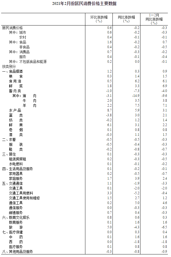 2月份,全國居民消費(fèi)價(jià)格環(huán)比上漲0.6%。其中,城市上漲0.6%,農(nóng)村上漲0.4%;食品價(jià)格上漲1.6%,非食品價(jià)格上漲0.4%;消費(fèi)品價(jià)格上漲0.7%,服務(wù)價(jià)格上漲0.4%。
