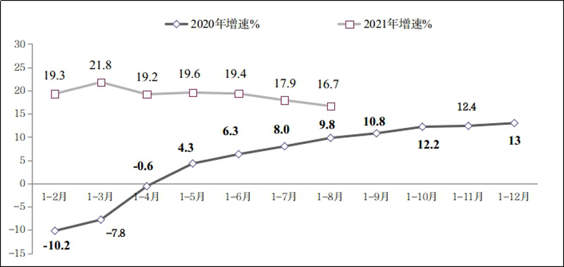 圖1 2020年-2021年1-8月份軟件業(yè)務(wù)收入增長情況