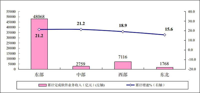 東北地區(qū)軟件業(yè)收入加快增長,西部地區(qū)增長明顯放緩。1-8月份,東部地區(qū)完成軟件業(yè)務(wù)收入48068億元,同比增長21.2%,比1-7月份回落0.6個(gè)百分點(diǎn),高出全國平均水平0.4個(gè)百分點(diǎn)。中部地區(qū)完成軟件業(yè)務(wù)收入2759億元,同比增長21.2%,比1-7月份回落0.6個(gè)百分點(diǎn)。西部地區(qū)完成軟件業(yè)務(wù)收入7116億元,同比增長18.9%,比1-7月份回落1.2個(gè)百分點(diǎn)。東北地區(qū)完成軟件業(yè)務(wù)收入1768億元,同比增長15.6%,比1-7月份提高0.3個(gè)百分點(diǎn)。四個(gè)地區(qū)軟件業(yè)務(wù)收入在全國總收入中的占比分別為80.5%、4.6%、11.9%和3.0%。