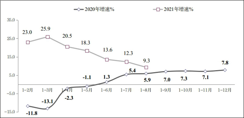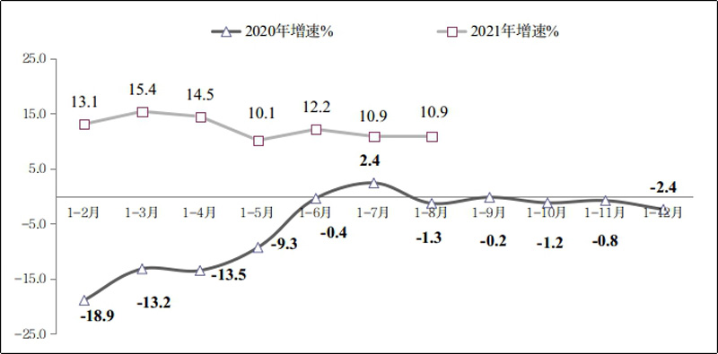 圖2 2020年-2021年1-8月份軟件業(yè)利潤總額增長情況