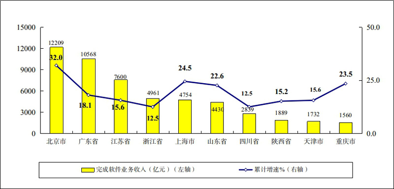 主要軟件大省業(yè)務(wù)收入兩位數(shù)增長,利潤保持平穩(wěn)增長。1-8月份,軟件業(yè)務(wù)收入居前6名的省份中,北京、廣東、江蘇、浙江、上海和山東軟件收入分別為12209億元、10568億元、7600億元、4961億元、4754億元和4430億元,分別增長32.0%、18.1%、15.6%、12.5%、24.5%和22.6%,六省(市)合計(jì)軟件業(yè)務(wù)收入44522億元,占全國比重為74.6%,占比較去年同期提高2個(gè)百分點(diǎn);共實(shí)現(xiàn)利潤總額5325億元,同比增長8.7%,低于全行業(yè)平均水平0.6個(gè)百分點(diǎn)。