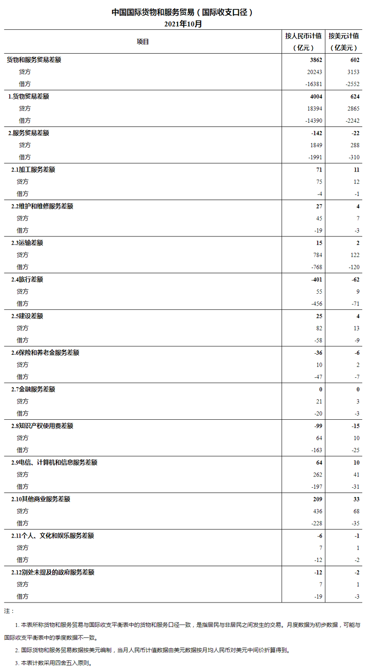 按美元計(jì)值,2021年10月,我國(guó)國(guó)際收支口徑的國(guó)際貨物和服務(wù)貿(mào)易收入3153億美元,支出2552億美元,順差602億美元。其中,貨物貿(mào)易收入2865億美元,支出2242億美元,順差624億美元;服務(wù)貿(mào)易收入288億美元,支出310億美元,逆差22億美元。