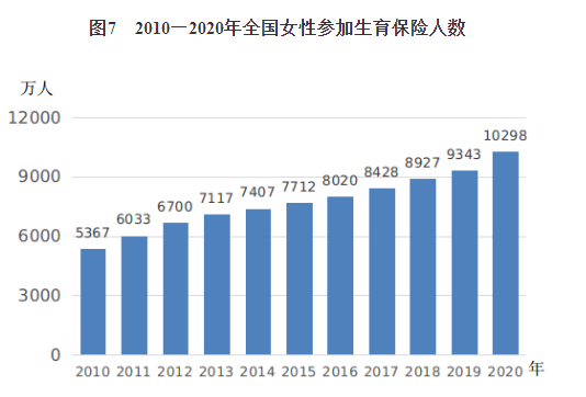 1.女性生育保險[9]覆蓋面明顯擴(kuò)大?!毒V要》實(shí)施期間,覆蓋全體婦女的生育保障制度體系逐步建立,生育保險和職工醫(yī)療保險合并實(shí)施全面推進(jìn),基金共濟(jì)能力明顯增強(qiáng);未就業(yè)婦女生育醫(yī)療費(fèi)用通過城鄉(xiāng)居民醫(yī)療保險解決政策的實(shí)施,實(shí)現(xiàn)了生育醫(yī)療費(fèi)用保障的全覆蓋。2020年末,女性參加生育保險的人數(shù)為1.03億人,比2010年增加4931萬人,是2010年的1.9倍(見圖7)。