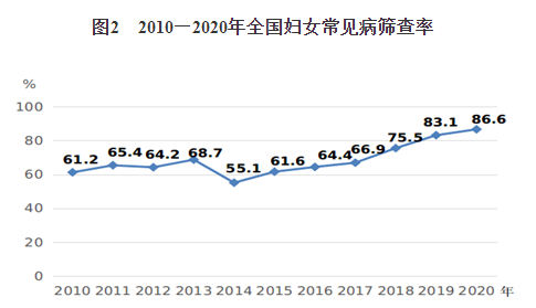 4.婦女生殖健康服務(wù)水平明顯提高。《綱要》實(shí)施以來,國家免費(fèi)孕前優(yōu)生健康檢查項(xiàng)目全面實(shí)施,孕前風(fēng)險防范意識不斷增強(qiáng);生殖健康知識大力普及,婦女自我保健意識和能力大幅提高。2020年,全國共為867萬名計(jì)劃懷孕夫婦提供免費(fèi)檢查,目標(biāo)人群覆蓋率平均達(dá)96.4%,篩查出的風(fēng)險人群全部獲得針對性的咨詢指導(dǎo)和治療轉(zhuǎn)診等服務(wù)。2020年,婦女常見病篩查率達(dá)到86.6%,比2010年提高25.4個百分點(diǎn),實(shí)現(xiàn)《綱要》“達(dá)到80%以上”的目標(biāo)(見圖2)。