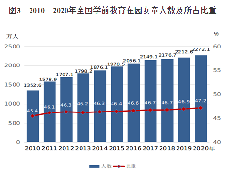 1.女童平等接受學(xué)前教育得到切實(shí)保障?!毒V要》實(shí)施以來,我國連續(xù)實(shí)施三期學(xué)前教育行動計(jì)劃,多種形式增加學(xué)前教育資源,切實(shí)保障女童平等接受學(xué)前教育的權(quán)益。2020年,全國共有學(xué)前教育(包括幼兒園和附設(shè)幼兒班)在園女童2272.1萬人,比2010年增加919.5萬人,增長68%,增速比全部在園兒童高6.1個百分點(diǎn);接受學(xué)前教育的女童所占比重為47.2%,比2010年提高1.7個百分點(diǎn)(見圖3)。2020年,全國學(xué)前教育毛入園率為85.2%,遠(yuǎn)高于《綱要》“達(dá)到70%”的目標(biāo)。
