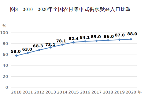 3.農(nóng)村人居環(huán)境持續(xù)改善。2018年,中央農(nóng)辦等18個部門聯(lián)合印發(fā)《農(nóng)村人居環(huán)境整治村莊清潔行動方案》,啟動并實(shí)施村莊清潔行動,目前農(nóng)村人居環(huán)境整治三年行動方案目標(biāo)任務(wù)全面完成。全國95%以上的村莊開展了清潔行動,村民的環(huán)境與健康意識進(jìn)一步增強(qiáng),村莊環(huán)境趨于干凈整潔。2020年,農(nóng)村集中式供水受益人口比重達(dá)到88.0%,比2010年提高30個百分點(diǎn),實(shí)現(xiàn)《綱要》“達(dá)到85%左右”的目標(biāo)(見圖8)。