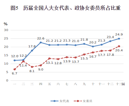 1.全國女人大代表和女政協(xié)委員占比均達(dá)歷史最高?!毒V要》實(shí)施以來,我國積極推動和支持婦女參政議政,婦女參與決策和管理的比例明顯提高,婦女的政治權(quán)利得到有力保障和加強(qiáng)。2018年召開的第十三屆全國人民代表大會共有女代表742名,占代表總數(shù)的24.9%,比第十一屆(2008年)提高3.6個百分點(diǎn),是歷屆人大代表中女性比重最高的一屆(見圖5)。政協(xié)第十三屆(2018年)全國委員會中有女委員440人,占委員總數(shù)的20.4%,比第十一屆(2008年)提高2.7個百分點(diǎn),也是歷屆政協(xié)委員中女性比重最高的一屆(見圖5)。