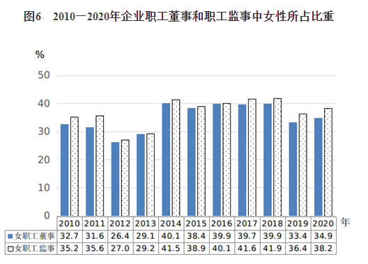 2.女性參與企業(yè)經(jīng)營管理更加深入?!毒V要》實(shí)施以來,我國經(jīng)濟(jì)社會加快發(fā)展,人們思想觀念不斷更新,公開、透明、擇優(yōu)的選拔任用機(jī)制持續(xù)完善,女性在企業(yè)管理中占據(jù)著越來越重要的地位。2020年,企業(yè)職工董事和職工監(jiān)事中女性比重分別為34.9%和38.2%(見圖6),分別比2010年提高2.2個和3.0個百分點(diǎn)。企業(yè)職工代表大會中女性代表比重[8]為30.2%,比2010年提高1.2個百分點(diǎn)。